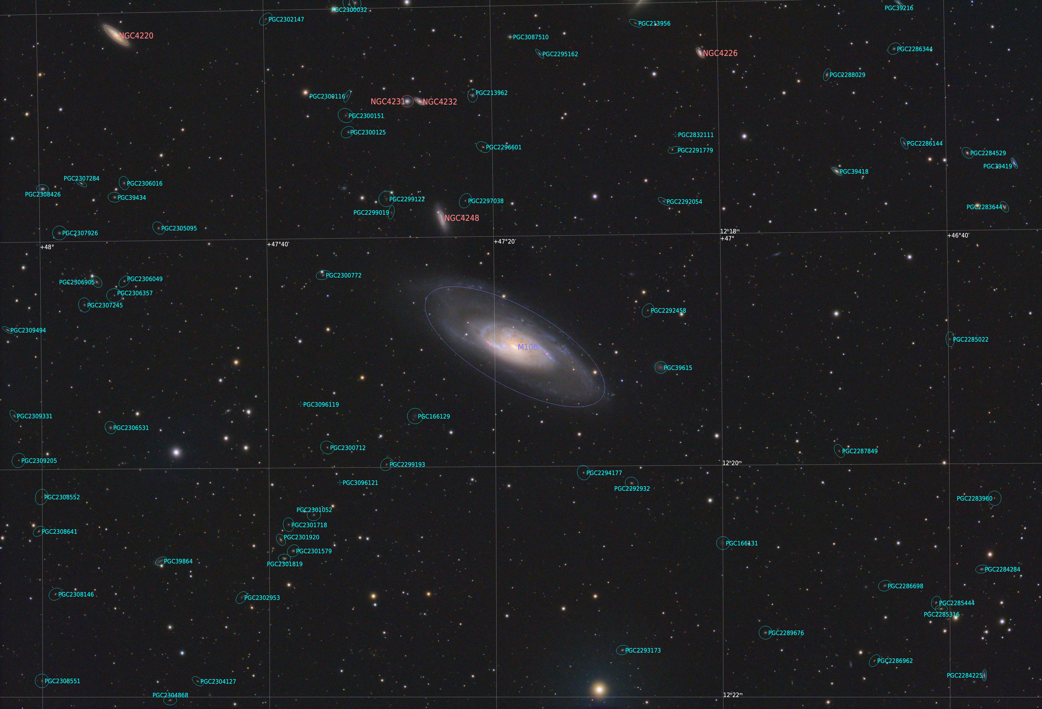 なんと38億光年かなたの銀河を確認できました。 M106の左上にあるNGC4248(オレンジ色の文字)の左隣にある2つの銀河PGC2299122,PGC2299019です。 もっと暗い銀河がこの周りにあるんですが、Skysafariでも表示されません。残念。 https://pharscape.org/2022/03/11/messier-106-and-the-faint-fuzzies/ 撮影日時:2026/01/24 01h30mから03h11m 180s X 30コマ 撮影場所:和歌山県西牟婁郡すさみ町 撮影機材:ASKAR103APO D=103mm 1.0Xフラットナー使用 f=700mm ASI294MC Pro Gain=120 -10°C SVBONY UV/IRカットフィルター 画像処理:Pixinsight(BXT NXT SXT GHS)