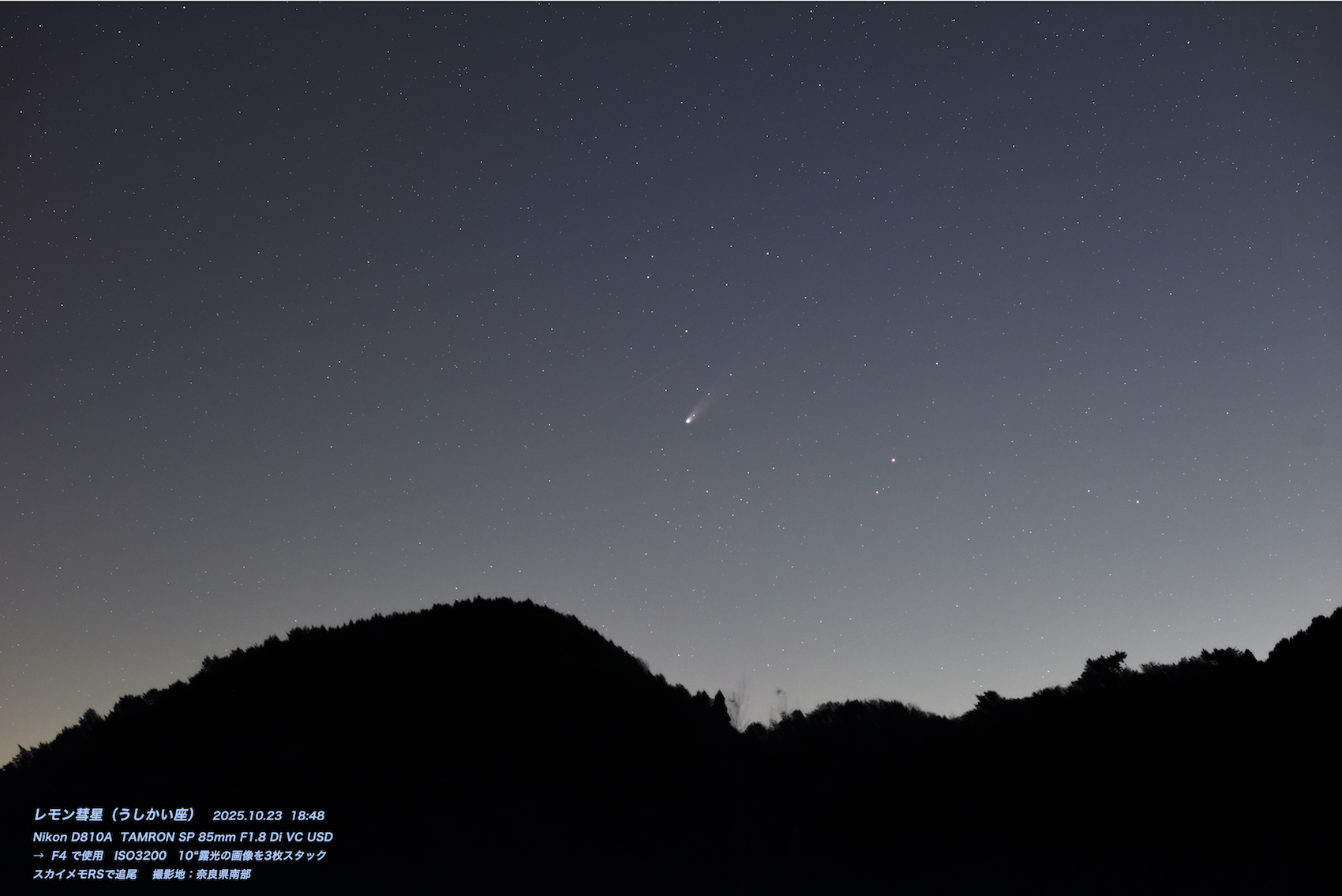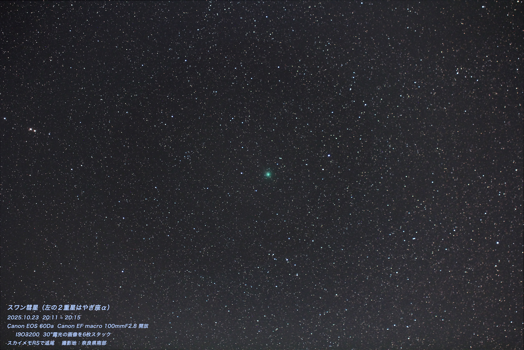 | 1: スワン彗星 New! / 2: レモン彗星 New! / 3: 無題 / 4: 10月の例会 / 5: C/2025 A6(Lemmon) (1) / 6: 黄道光X (2) / 7: 皆既月食 (3) / 8: 土星とその衛星 / 9: 海王星とトリトン / 10: 2025/9/6 太陽 / 11: 土星 / 12: 月と3惑星 / 13: 土星と衛星 / 14: さそり座のSh-1 / 15: 月の出 / 16: C/2025 F2 (SWAN 25F)彗星 / 17: 再びすさみへ遠征しました。夕日です。 (1) / 18: 久しぶりのすさみ / 19: 再びすさみへの さそり座 / 20: すさみへ (1) / |